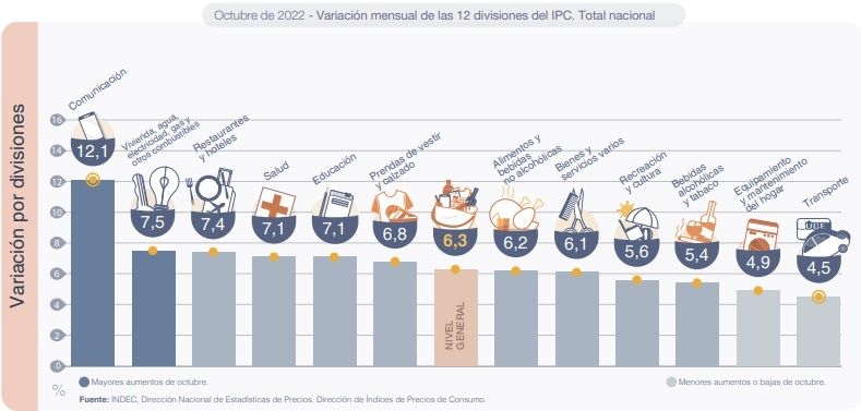En el acumulado del año el índice de precios al consumidor trepa a 76,6%. Por su parte, en la medición interanual la inflación de octubre quedó en 88% en relación a octubre de 2021, abonando la tesis de numerosos analistas que ven una inflación anual en torno al 100%.