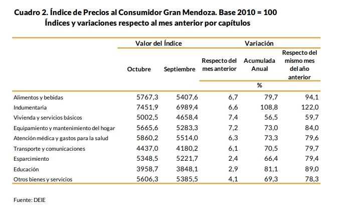 La Dirección de Estadísticas e Investigaciones Económicas de Mendoza (DEIE) informó este martes que la inflación en el mes de octubre fue de 6,2% en la provincia, diferenciándose así del 6,5% alcanzado durante septiembre y del 6,9% de agosto.