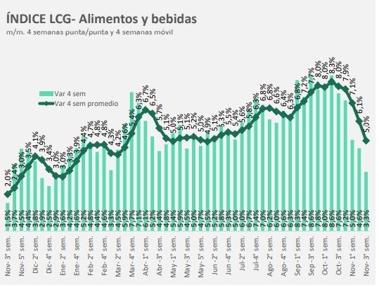 "En la tercera semana de noviembre la suba de precios de los alimentos promedió 0,62%, desacelerándose 0,56 puntos porcentuales respecto de la semana anterior", señala un informe de la consultora LCG. Agregó que el índice de alimentos y bebidas "presentó una inflación mensual de 5% promedio en las últimas cuatro semanas y 3,3% punta a punta en el mismo período".