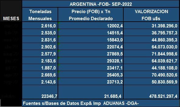 La medición va desde enero hasta septiembre 2022 en la posición arancelaria de la República Argentina para el “carbonato de litio”, según su número 2836.91.00 G unidad estadística en kilogramo y/o toneladas ramo III-productos minerales y químicos código AFIP/Tram 0028.00.00.000P.