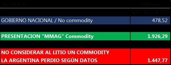 Es decir, nuestro país perdió el ingreso de esas divisas, como así también el pago de derechos de exportación por US$ 48,4 millones. Si tomamos un promedio mensual sobre las diferencias de criterios de determinar que el litio no es un commodity la Argentina reflejaría una pérdida proyectada anual de unos 2.969 millones de dólares en términos de comparación. Sería como perder un 7,7% de las reservas actuales del Banco Central de la República Argentina.
