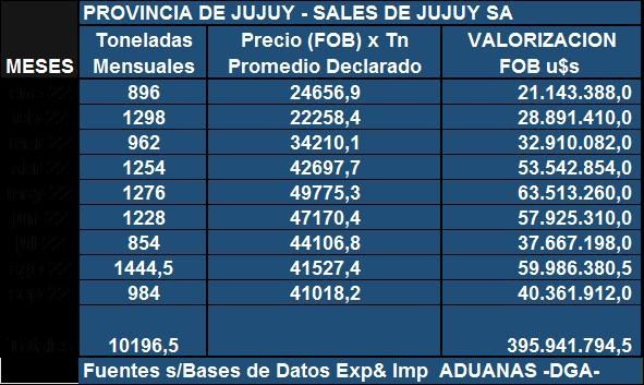 La provincia de Jujuy, según los datos estadísticos representa un total exportado de 10.196,5 x Tn, cuyo valor FOB declarado es de US$ 395,9 millones, lo que representa un 83% del total exportado entre las dos provincias en producción actual (Jujuy y Catamarca).