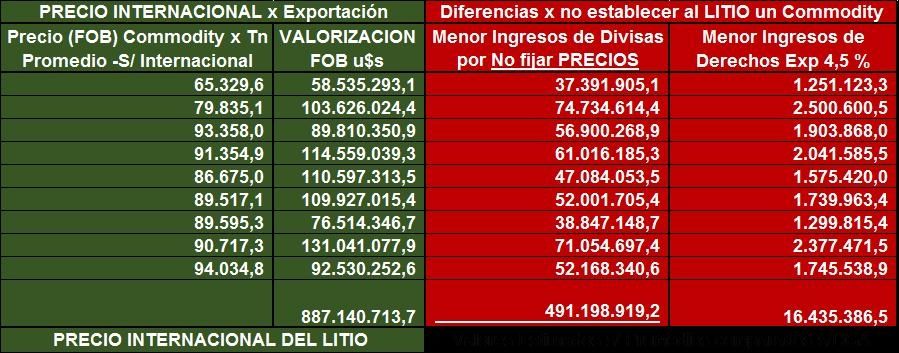 Dejando totalmente aclarado que la subfacturación que se detecte en todo el Territorio Nacional Argentino, la subfacturación se encuadra sobre el delito de evasión fiscal. Argentina, perdió, por no declarar al litio como un commodity unos u$s 1.447,8 millones y por la otra parte no se soluciona fijando los precios en la Bolsa de Hong Kong, si queremos desarrollar un país dónde se proteja la soberanía nacional.