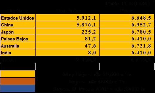 Podemos observar que los principales destinos sus precios FOB, se encuentran por debajo de los precios internacionales, en los cuales encontramos los siguientes países de mayor exportación: Estados Unidos y China. Demostrando que el litio, no tiene un mercado regulado desde Argentina y tales diferencias de criterios les genera una gran pérdida a la Argentina.