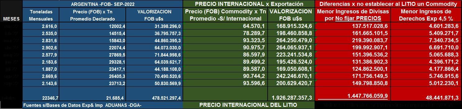 Esto demuestra que ambas provincias se encuentran con diferentes tratamientos en especial de transformar al litio como un commodity. En este último cuadro visualizamos que el FOB declarado desde enero 2022 hasta septiembre 2022 fue de US$ 478,5 millones comparado con la valuación del precio internacional (commodity) del carbonato que fue de unos US$ 1.926,9 millones de dólares, estaríamos determinando una diferencia de US#$ 1.447,8 millones, producto de no regular la fijación del precio internacional en las regiones (Argentina).