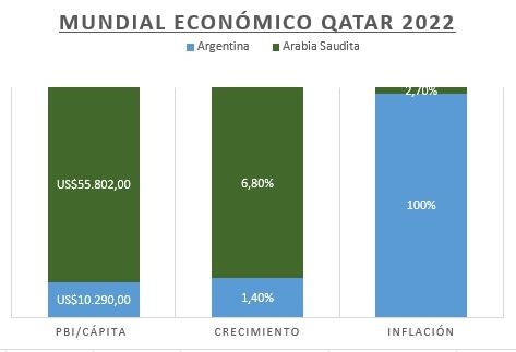 Si se compara directamente a los países que hoy se enfrentan en Qatar, por lo que respecta al PBI per cápita, el de Arabia Saudita es más de 5 veces superior al de Argentina con US$55.802 frente a US$10.729.