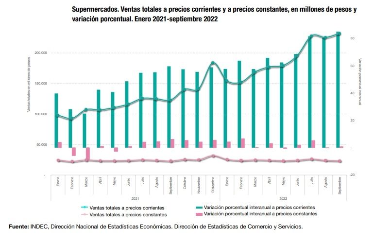 Las ventas en supermercados llegaron a $23.137 millones en septiembre, en la medición a precios constantes, lo que marcó un leve incremento de 0,8%, mientras que medidos a precios corrientes se ubicó en $232.153, lo que marcó un incremento del 88,7%, informó esta tarde el Instituto Nacional de Estadística y Censos (Indec).