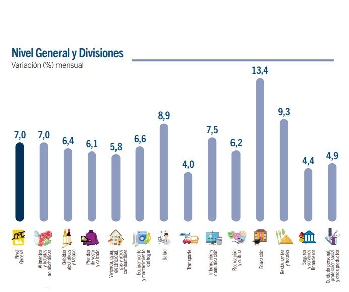 En el desagregado por sectores el top five de aumentos viene liderado por Educación con un sorprendente 13,4% en el mes, siguiendo Restaurantes y hoteles (9,3%), Salud (8,9%), Información y comunicación (7,5%), y un complicado 7% en Alimentos y Bebidas no alcohólicas (7%).