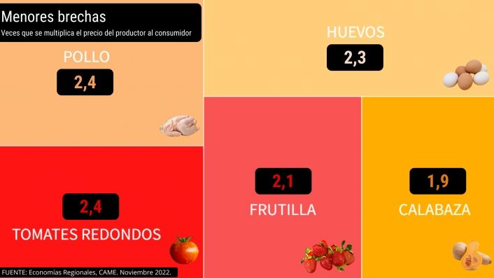Además, y entre los cinco productos que presentaron mayor diferencia entre los precios del campo a la góndola, se encuentran la zanahoria (13,9 veces), el limón (12,4), la naranja (9), la manzana roja (8,5) y el zapallito (8,1).