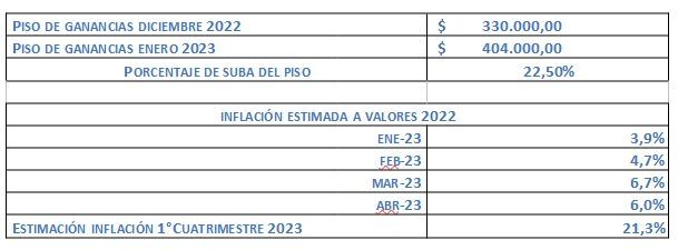El siguiente cuadro ejemplifica cómo la suba del piso de Ganancias de enero de 2023 choca directamente con una inflación estimada a valores de 2022.