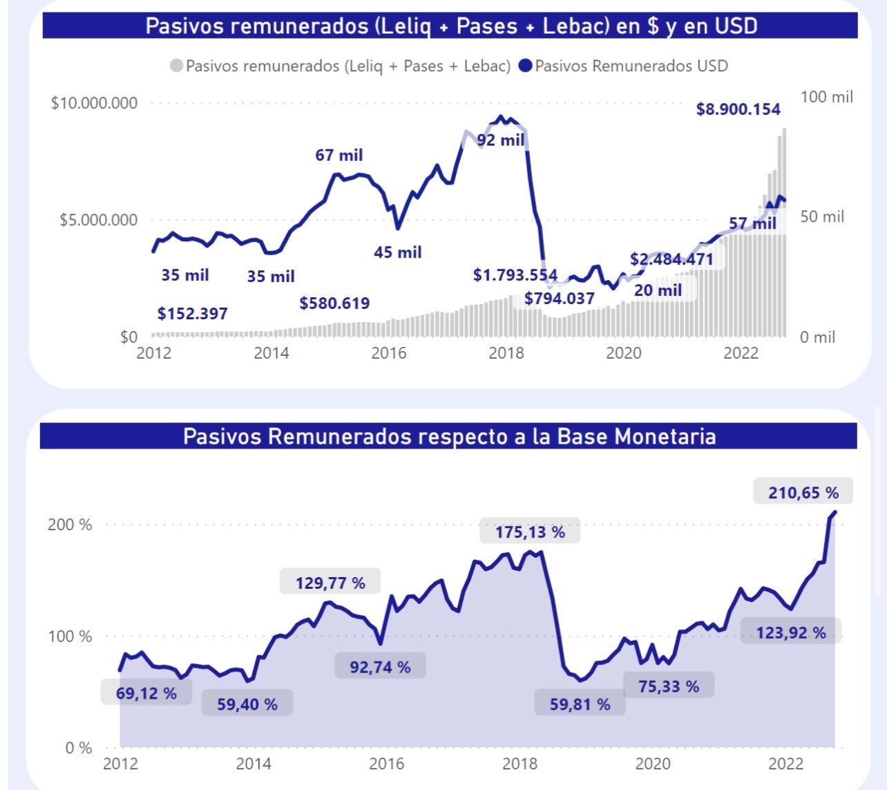 La clave para comprender esta posición está en los números del Banco Central y la "montaña rusa" de Leliq (Letras de Liquidez del Banco Central) y otros pasivos remunerados, títulos y letras que emite la autoridad monetaria para esterilizar y sacar de circulación una parte de los pesos que antes fueron lanzados al mercado por la fuerte emisión monetaria.