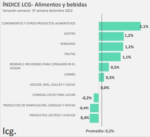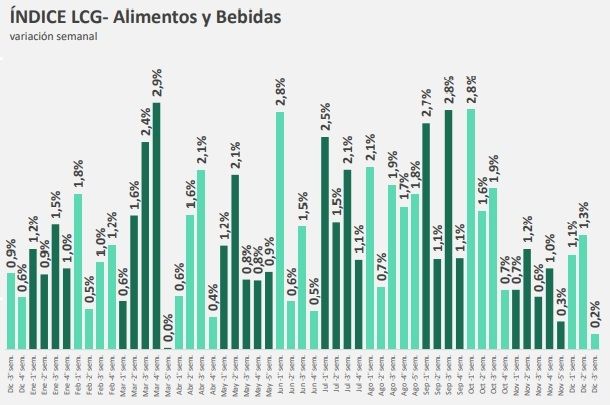 De acuerdo al relevamiento semanal de la consultora LCG en la tercera semana de diciembre la suba de precios de los alimentos promedió 0,18%, "desacelerando 1,16 puntos porentuales respecto la semana anterior".