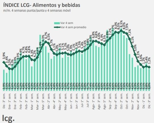 Con este dato, el índice de alimentos y bebidas "presentó una inflación mensual de 3,2% promedio en las últimas 4 semanas y 3% punta a punta en el mismo periodo", remarcó el estudio.
