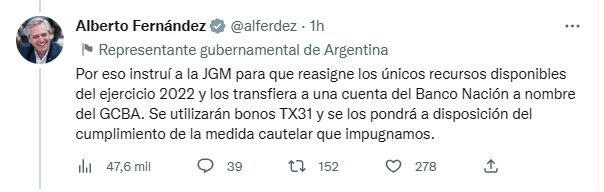 "Por eso instruí a la JGM para que reasigne los únicos recursos disponibles del ejercicio 2022 y los transfiera a una cuenta del Banco Nación a nombre del GCBA. Se utilizarán bonos TX31 y se los pondrá a disposición del cumplimiento de la medida cautelar que impugnamos", aseguró Alberto Fernández.