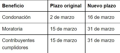 La Administración Federal de Ingresos Públicos (AFIP) otorga más tiempo para que los contribuyentes puedan acceder a los beneficios previstos en la ley de Alivio Fiscal. La solicitud para la condonación de deudas inferiores a $100.000 podrá realizarse hasta el 16 de marzo, mientras que la adhesión a la moratoria y los beneficios para contribuyentes cumplidores se extienden hasta el 31 de marzo.