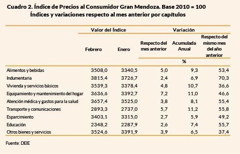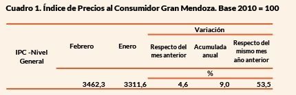 El Índice de Precios al Consumidor en la provincia de Mendoza fue de 4,6% en febrero, superando al del mes de enero (4,4%), según indicó la Dirección de Estadísticas e Investigaciones Económicas. En tanto, respecto al mismo mes del año pasado la inflación aumentó 53,3%.