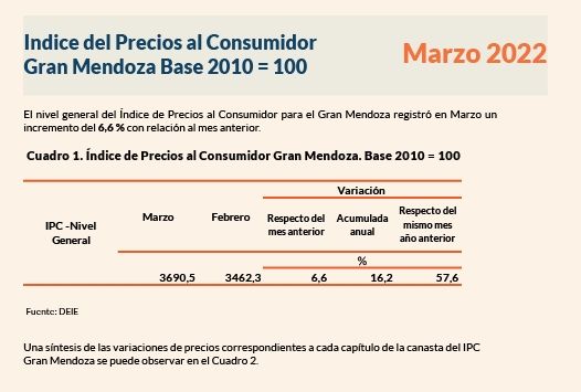 A los alimentos y bebidas le siguen educación con 7,6%, otros bienes y servicios con 6,0% e indumentaria y transportes y comunicación con un 5,3%. Equipamiento y mantenimiento del hogar había sido lo más alto en febrero en Mendoza con 7,2%, mientras que alimentos y bebidas se ubicó por entonces en tercer lugar con un incremento del 5,0%, siendo casi duplicado en marzo.