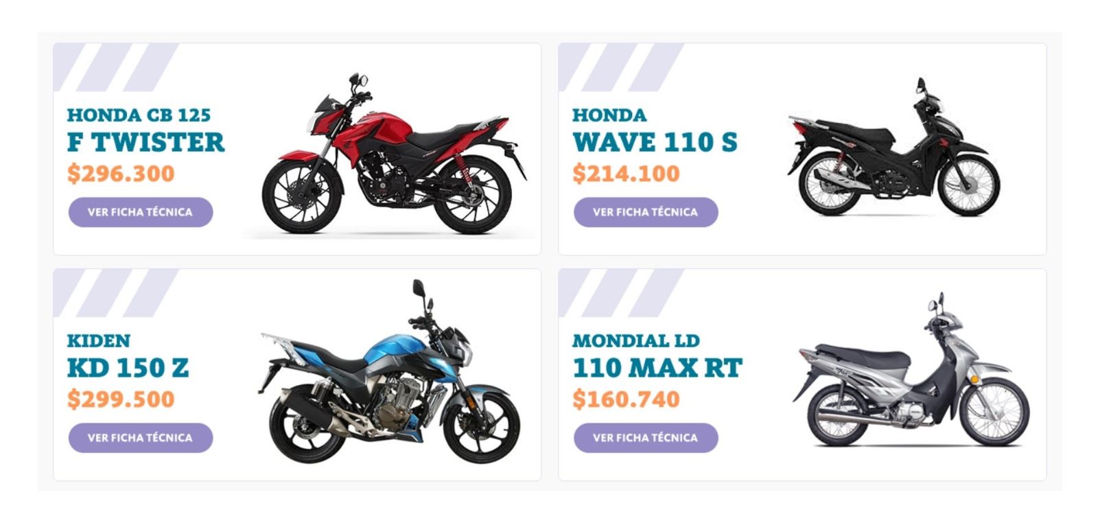 Algunos de los modelos disponibles son la Bajaj Boxer AT, que tiene un precio de venta en la tienda BNA de $287.883; la Corven Energy Base, cuya cotización es de $164.158; la Brava Nevada Base, a $162.900; y la Gilera Smash Full, a $180.500. También se pueden conseguir la Guerrero G 110 Econo, a $168.980; la Keller Classic 110, a $149.297 y la Honda CB 125 f Twister, a $296.300.