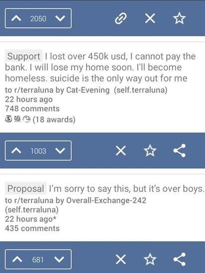 Algunos de los afectados por el desplome de Luna comentaron su frustración en foros como Reditt, alegando que la divisa "era una estafa" o que habían perdido los ahorros que estaban juntando para comprarse una casa.