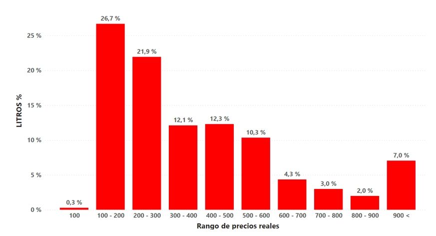 Desde el sector indicaron que el consumo total del primer este trimestre, en precios reales expresados en pesos de marzo del 2022, se ha concentrado en el rango de los 100 y 200 pesos por litro en un 27%, mientras que el 84% del consumo estuvo en el rango de los 100 a 600 pesos por litro.