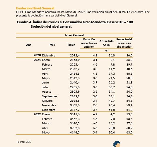 La Dirección de Estadísticas e Investigaciones Económicas (DEIE) comunicó este martes que el nivel general del Índice de Precios al Consumidor (IPC) para Mendoza registró en mayo una variación del 5,4% con relación al mes anterior. La provincia acumula un 30,4% desde que inició el 2022.