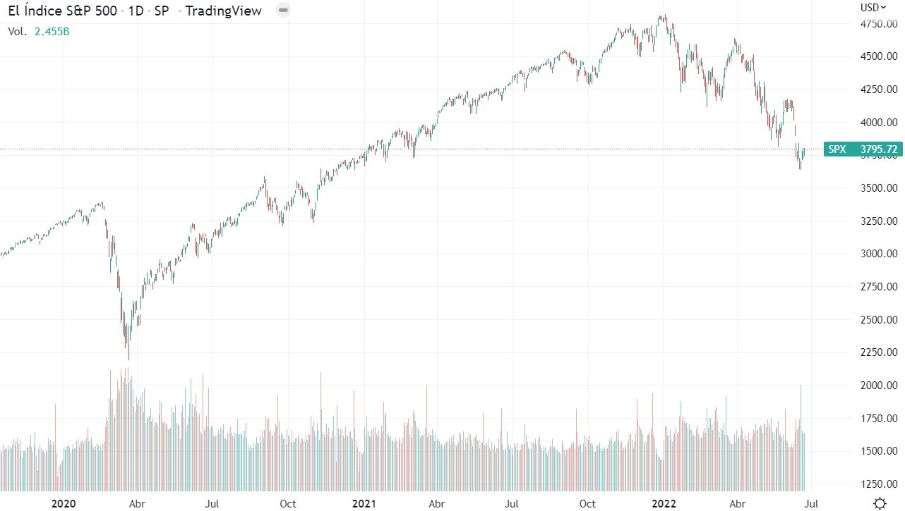 Este es el gráfico con la evolución del precio y el volumen del índice S&P 500, que sigue a las 500 empresas más grandes de la bolsa de EE.UU.