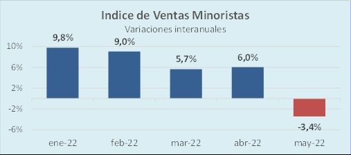 - "Sin embargo, y pese a la caída del 3,4% anual en mayo, las ventas acumulan un alza de 5,4% en los primeros cinco meses del año frente al mismo periodo del 2021".