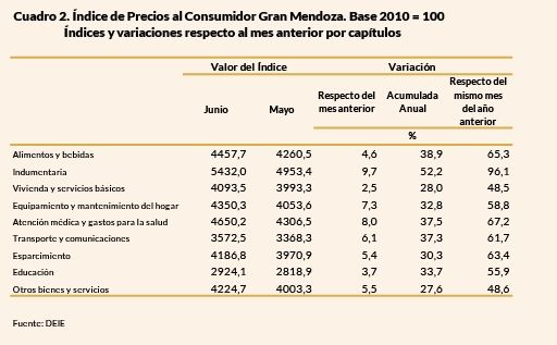 Este jueves se dio a conocer que la inflación en Mendoza durante el mes de junio fue de 5,9%, acumulando así un total anual de 38,2%. De esta forma continúa la tendencia alcista, la cual puede verse reflejada en distintos rubros. Entre lo tomado en cuenta en el informe brindado por la Dirección de Estadísticas e Investigaciones Económicas (DEIE), se destacan fuertes incrementos en indumentaria y salud.