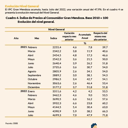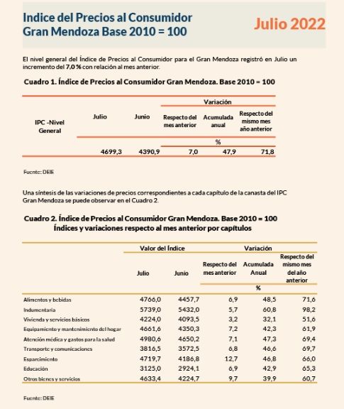La Dirección de Estadísticas e Investigaciones Económicas de la provincia (DEIE) informó que el nivel general del Índice de Precios al Consumidor para el Gran Mendoza registró en julio una variación del 7% con relación al mes anterior. La acumulación anual, es decir desde enero de 2022, ya alcanzó 47,9%. Respecto al mismo mes, pero de 2021, la variación es de 71,8%