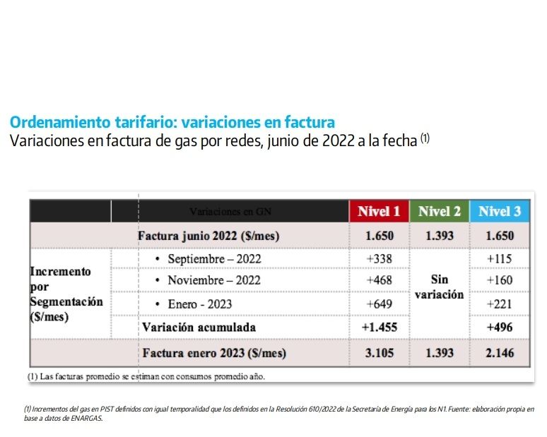 La medida de incrementos a partir de niveles de consumo para los usuarios de nivel 3, plantea tres aumentos con una aplicación gradual por bimestres a partir de septiembre, implicando un aumento promedio cercano a los 165 $/mes por escalón y 500 $/mes acumulado en los 3 bimestres, indicaron fuentes oficiales.