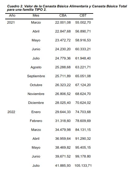 Si se tiene en cuenta la Canasta básica de junio, que fue de $99.178, se trata de un incremento de $5.955 para que un hogar tipo 2, integrado por un jefe de 35 años, su cónyuge de 31, su hija de 8 y su hijo de ; 5 no sea pobre. Para no ser indigente, el aumento fue de $2.214.