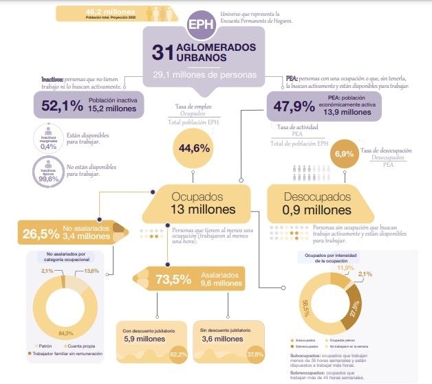 El Instituto Nacional de Estadísticas y Censos (Indec) informó este miércoles que la tasa de desempleo en Argentina es del 6,9%. En comparación con el último trimestre (siempre se analiza tomando como referencia los tres meses anteriores) la reducción fue ínfima, ya que el dato de junio dio 7%, misma cifra que en marzo de este 2022.