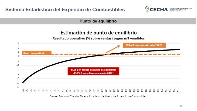 Pero el problema central para los empresarios del sector es la pérdida de rentabilidad. De acuerdo al relevamiento, a precios de julio de 2022, se necesita vender 283.000 litros mensuales (283 m3) para alcanzar el punto de equilibrio. Con este parámetro el 48,1% de las estaciones de servicio no alcanza a cubrir los costos con las ventas de combustible.