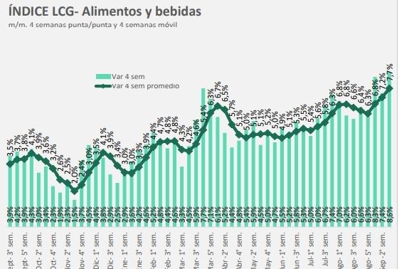 La consultora LCG anticipó este viernes que la variación de precios promedio de alimentos y bebidas en la última semana se ubicó en 2,8%, marcando una aceleración de 1,7 puntos porcentuales respecto de la semana previa. Con este dato el promedio de las últimas cuatro semanas llega a 7,7% y "acumula 8,6% punta a punta en el mismo período".