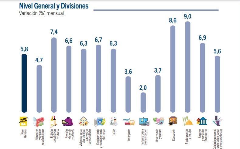 Con una variación interanual de 93,4%, en la medición de la Ciudad los principales aumentos estuvieron en el rubro de Restaurantes y hoteles con una suba promedio de 9%. El factor estacional y el incremento, en especial, de los alimentos en las cartas de bares, restaurantes y casas de comida fue lo que impulsó los precios en el sector.