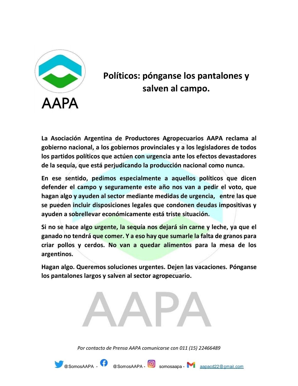 En tanto, la Asociación Argentina de Productores Agropecuarios (AAPA) publicó en su cuenta de Twitter un comunicado en el que reclama tanto al Gobierno como a la oposición "medidas urgentes frente a los efectos devastadores de la sequía". Piden por la condonación de deudas y ayudas económicas para enfrentar la situación.