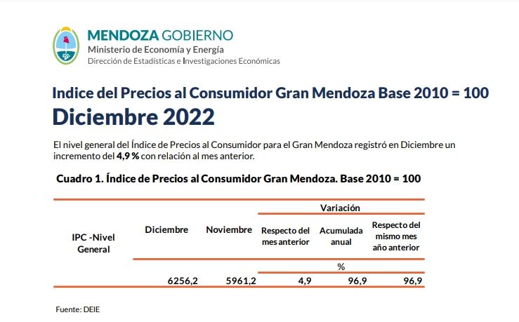La estadística inflacionaria de noviembre fue similar, es decir, también de 4,9%. Sin embargo, en esta ocasión se terminó de confirmar la escalada inflacionaria en el transcurso del 2022, alcanzando así un 96,9% en territorio mendocino.