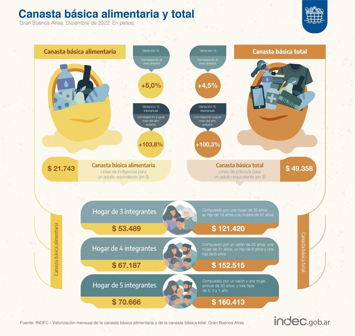 En todo el 2022, la canasta básica aumentó 100,3% mientras que la alimentaria subió 103,8%.