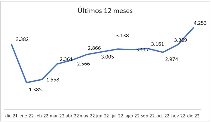 El informe realizado por el Colegio de Escribanos que toma de referencia a los actos oficializados por escribanos de la Ciudad Autónoma de Buenos Aires informó que se realizaron en diciembre del año que pasí 4253 actos de compraventa, lo que representó una suba en escrituras del 25,7% respecto del mismo mes del año anterior. El monto total de transacciones, en tanto, fue de $72.175 millones, es decir un 45,9% más que un año atrás. En tanto, si comparamos diciembre con noviembre de 2022, es posible ver un crecimiento de 26,2%.