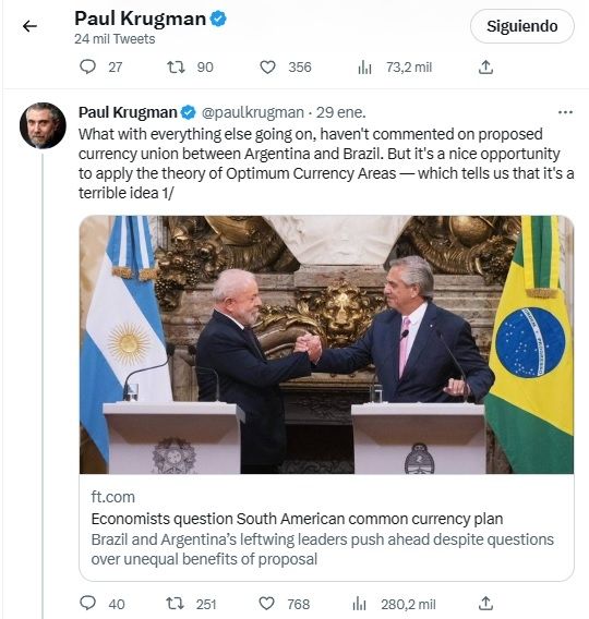 "Una moneda compartida podría tener sentido entre economías que son los principales socios comerciales de cada una y son lo suficientemente similares como para no experimentar grandes shocks asimétricos", dijo Krugman.