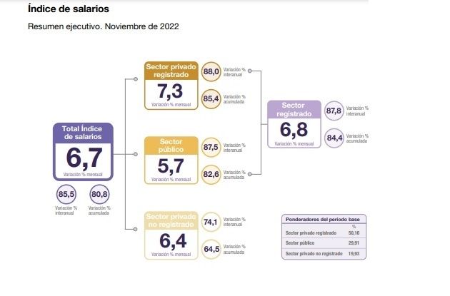 El organismo informó que los sueldos sumaron un 6,7% mensual, con lo que crecieron un 85,5% interanual, es decir, contra la medición de noviembre de 2021. Este número contrasta con el índice de inflación que para noviembre de 2022 llegaba al 92,4% interanual según la misma entidad.