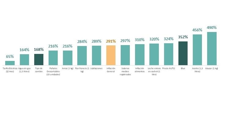 Uno de los precios que más creció fue el dólar blue que saltó un 352%. No obstante, hubo dos productos de la canasta básica alimentaria que superaron ampliamente este valor. El precio del aceite subió un 456% y la azúcar un 490%, casi un 70% adicional al valor promedio de la inflación.