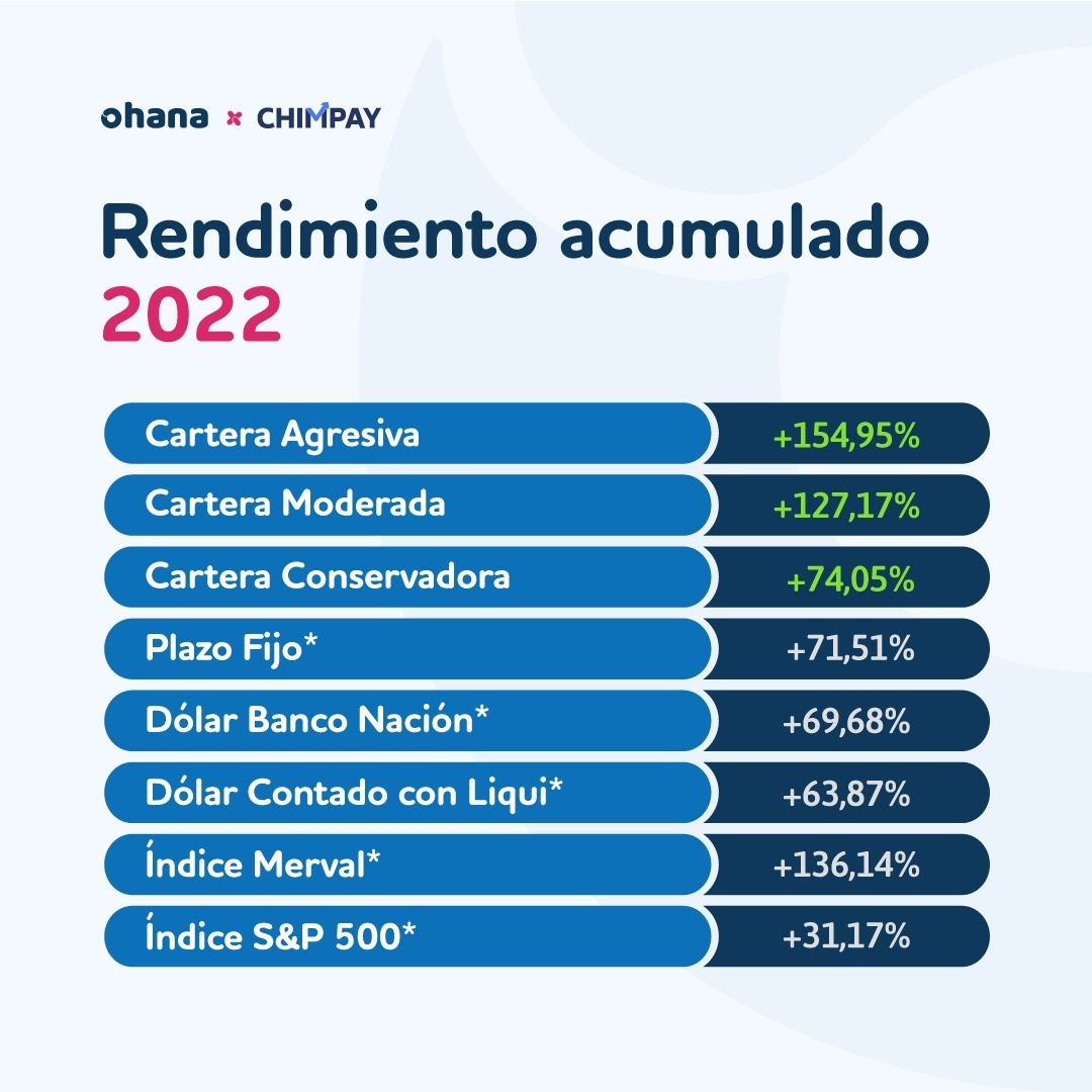 Ahora yendo a las opciones nuestras carteras recomendadas tuvieron excelentes resultados. Podemos decir que al 30/11/2022 nuestra cartera conservadora tiene una rentabilidad acumulada en el 2022 del 62,89%, la moderada del 111,80% y la agresiva del 155,76%. Las tres opciones han sido convenientes frente a las alternativas tradicionales como plazo fijo, dólar o FCI este año.