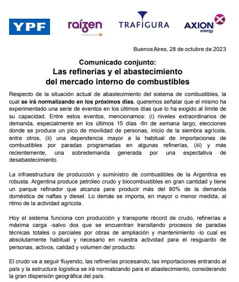 A raíz del problema, las refinerías emitieron un comunicado en conjunto sobre el abastecimiento del mercado interno de los combustibles. "Respecto de la situación actual de abastecimiento del sistema de combustibles, la cual se irá normalizando en los próximos días, queremos señalar que el mismo ha experimentado una serie de eventos en los últimos días que lo ha exigido al límite de su capacidad", comenzaron diciendo.