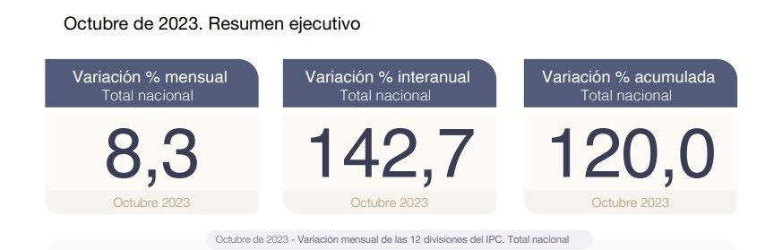 El índice de precios al consumidor (IPC) de octubre quedó en 8,3%, informó este lunes el Instituto Nacional de Estadística y Censos (Indec), marcando, además, un acumulado en lo que va del año del 120% y de 142,7% en la comparación interanual.