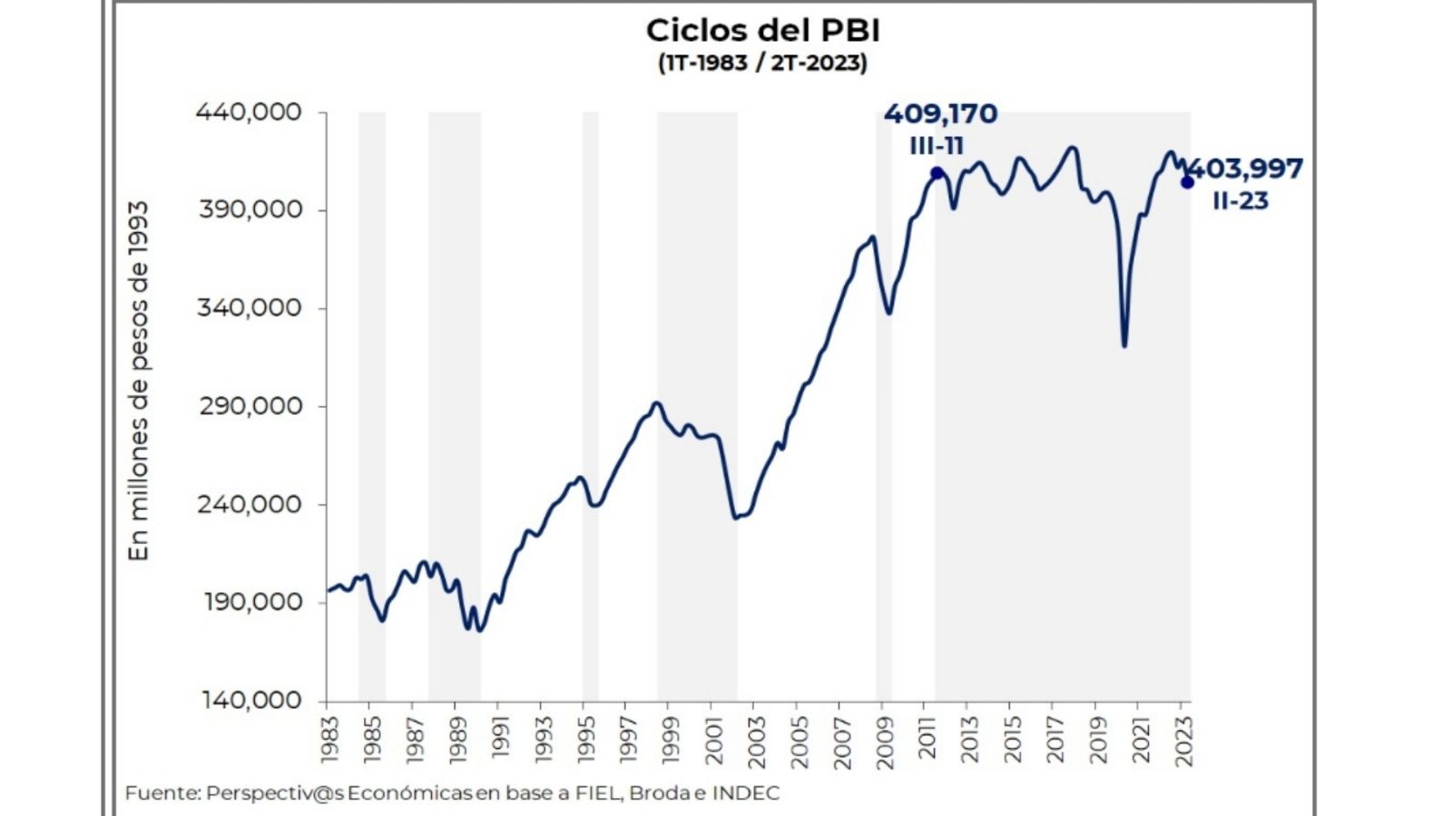 Las dificultades para cerrar la brecha fiscal, el endeudamiento y la inflación llevaron a que la Argentina enfrentara una serie de crisis cada vez más graves. La peor de todas ocurrió en diciembre de 2001, y aunque pareció ser el final, no lo fue. Hoy enfrentamos una nueva crisis, pero esta vez de más larga duración. Tenemos el mismo PBI que hacia fines de 2011, y en el escenario más probable volveremos a repetir la experiencia de 15 años consecutivos de estancamiento económico (tal como sucedió entre 1975 y 1990).