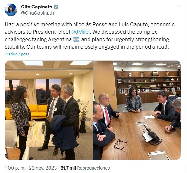 "Positivo encuentro con Nicolás Posse y Luis Caputo, asesores económicos del presidente electo @JMilei. Discutimos los complejos desafíos que enfrenta Argentina y los planes para fortalecer urgentemente la estabilidad. Nuestros equipos seguirán estrechamente comprometidos en el próximo período", escribió en su cuenta de X Gita Gopinath, la primera subdirectora gerente del Fondo Monetario Internacional (FMI).