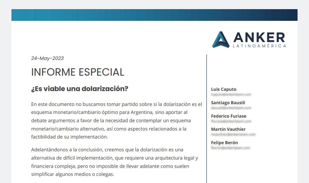 El pensamiento de Caputo sobre la dolarización fue expresado de manera clara y privada el 24 de mayo pasado a través de un "informe especial" que la consultora Anker Latinoamérica -de su propiedad- publicó en estricta exclusividad para sus clientes (la mayoría inversores internacionales), en tiempos en que Javier Milei comenzaba a definir los ejes de su campaña electoral que lo llevarían a la presidencia en las elecciones del 19 de noviembre.