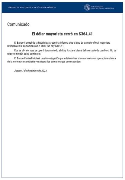 Sin embargo, el Banco Central salió a desmentir esa suba y desde la entidad aclararon que en realidad “el tipo de cambio oficial mayorista reflejado en la comunicación A 3500 fue hoy $364,41".