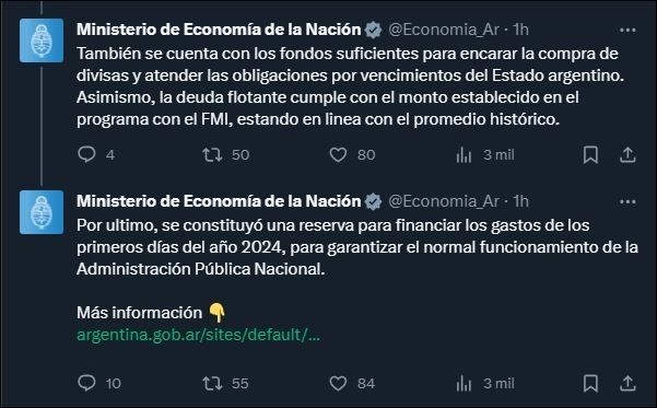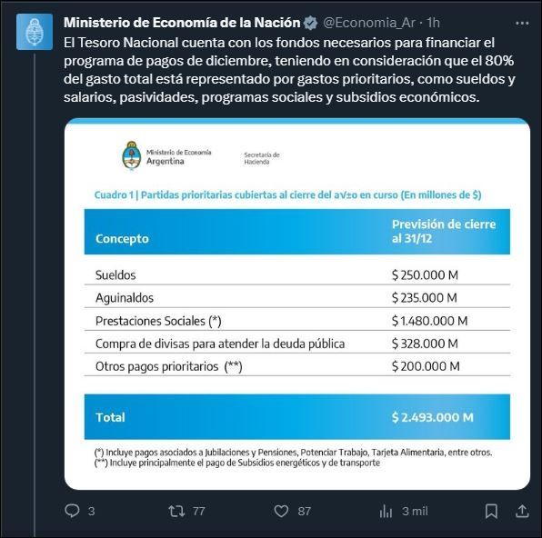 "El Tesoro Nacional cuenta con los fondos necesarios para financiar el programa de pagos de diciembre, teniendo en consideración que el 80% del gasto total está representado por gastos prioritarios, como sueldos y salarios, pasividades, programas sociales y subsidios económicos", expresó la Secretaría de Hacienda en una serie de mensajes difundidos por el Ministerio de Economía a través de la red social X (antes Twitter).